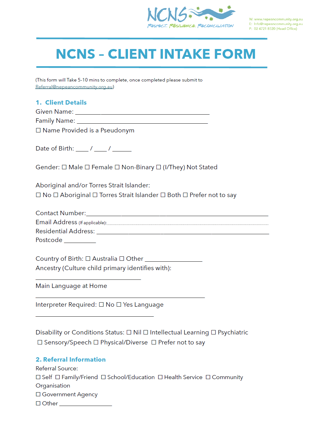 NCNS Client intake Form Fillable PDF